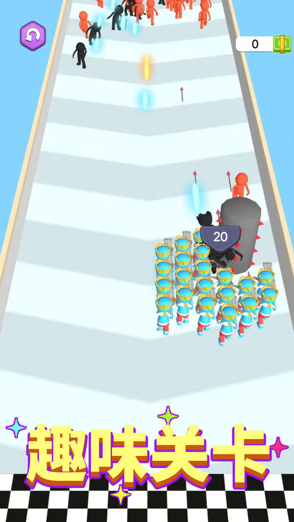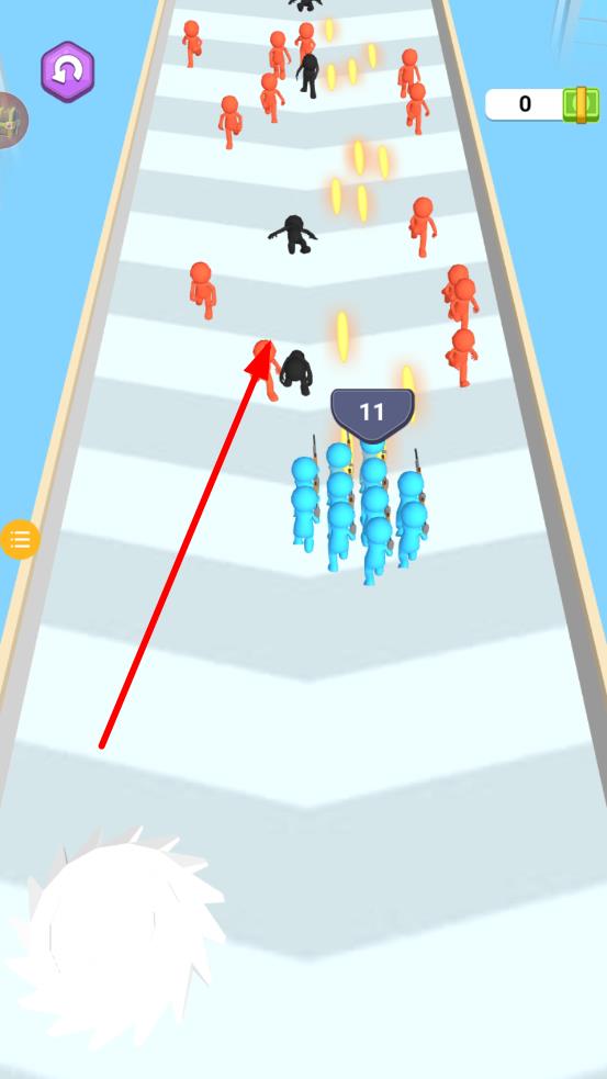 2、操控军队左右移动躲避敌人攻击,借助自动射击消灭敌人,优先拾取增加人数的道具强化实力,遇到道具合理判断增益减益,以增强自身军队实力。