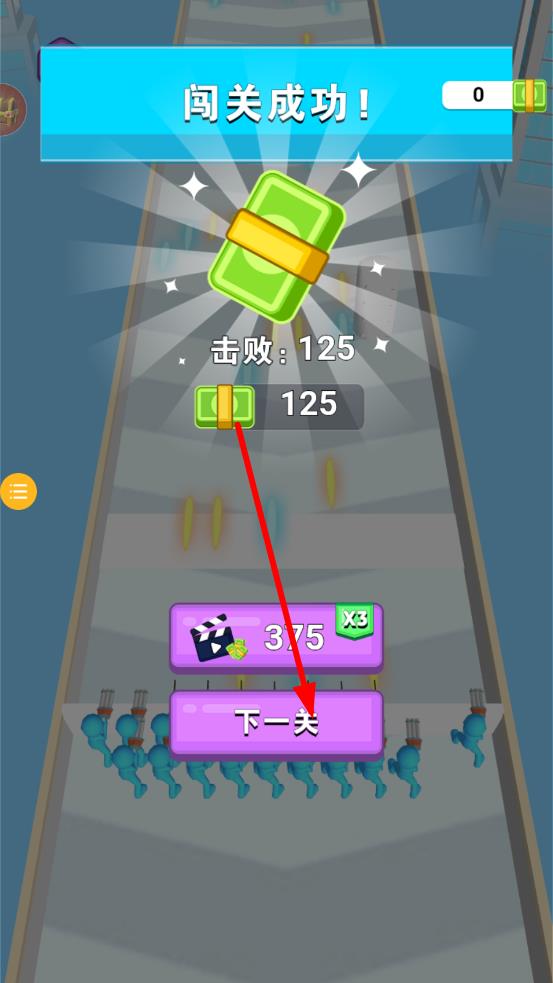 3、持续击杀敌人推进,消灭所有敌人后显示“闯关成功”,点击“下一关”进入新挑战,积累的金币可去商店强化军队,开启新的关卡冒险。