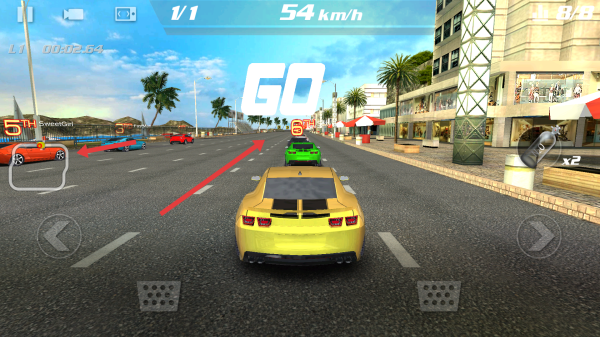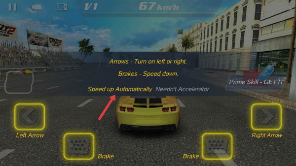 1、在城市赛道驾驶黄色赛车,通过左右箭头按键转向,刹车键减速,利用“Speed up Automatically(自动加速)”功能保持高速。