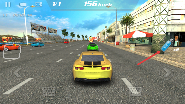 2、比赛中收集“N2O(氮气)”道具(右侧蓝色瓶),使用后可短时间加速超车,超越绿色、蓝色等对手车辆。