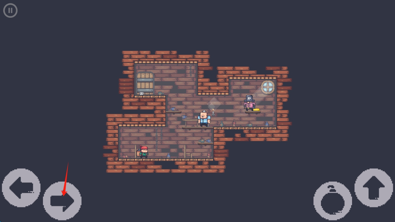 2、游戏关卡场景,玩家操控红帽角色在砖结构地图探索,界面有方向、炸弹、跳跃按钮,点击移动人物。