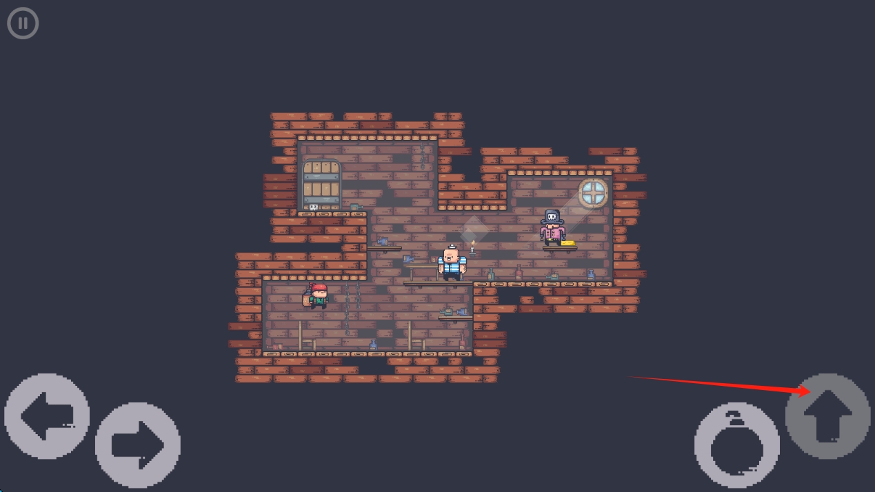 3、延续关卡场景,角色位置变化,箭头指向跳跃按钮,突出平台跳跃、场景互动的冒险玩法,包含敌人(骷髅角色 )、点击跳跃。