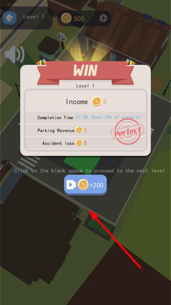 3、成功疏通车辆,界面显示“WIN”及收益详情,点击空白处或对应按钮,进入下一关,用积累金币开辟新停车场或拓宽现有场地。
