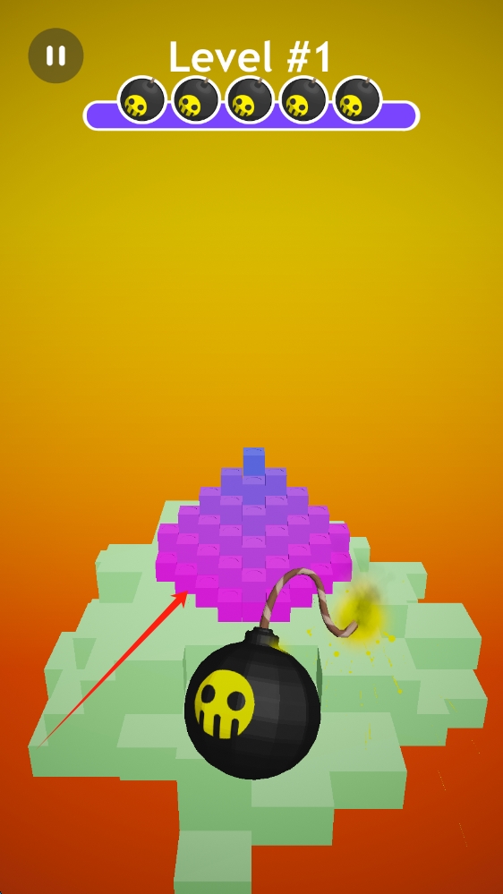 1、第 1 关,操控黑色炸弹(带骷髅标识 )撞击彩色方块堆,界面有暂停按钮、点击开始下一 。