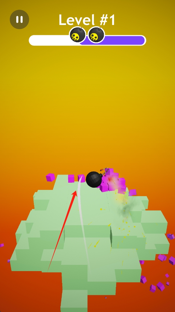 2、炸弹滚动摧毁紫色方块,进度条剩余 2 个炸弹,呈现破坏、推进玩法,点击抛出。
