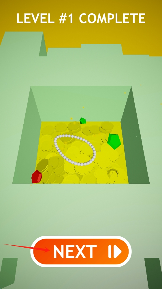 3、“LEVEL #1 COMPLETE”(第 1 关完成 ),奖励宝箱含金币、珠宝,“NEXT”(下一关 )按钮引导继续挑战,点击下一关。