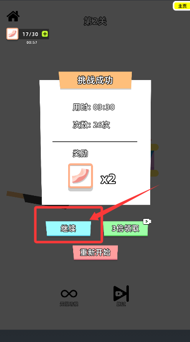 4、通关后选择"再接再厉"继续征战新关卡,并领取成就奖励。