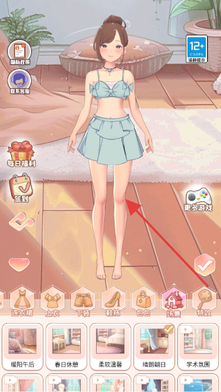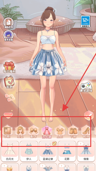 2、进入装扮界面,利用下方【连衣裙】【上衣】【下装】等分类选项,挑选心仪服饰部件,为角色搭配出独特造型,提升角色魅力值。