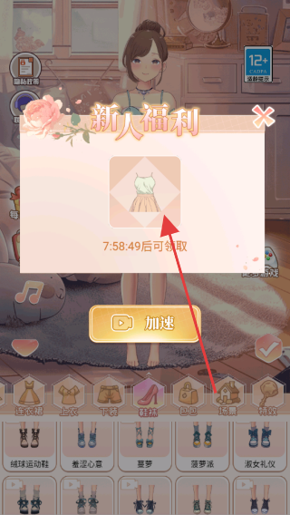 1、在游戏中看到【新人福利】弹窗,留意倒计时,7小时58分49秒后可领取福利服装。也可点击【加速】提前获取,丰富角色装扮。