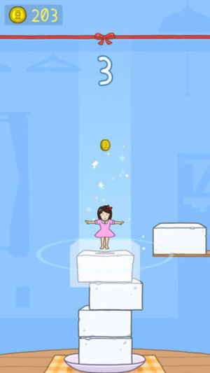 2、游戏中设有完美跳跃机制,当角色准确跳到豆腐中心时会获得额外分数和硬币奖励,鼓励玩家追求更高的精准度和更好的表现。