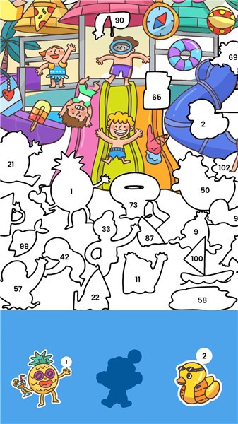 2、进阶关卡引入多层贴纸机制,需要按照特定顺序覆盖才能呈现立体效果。隐藏关卡要求发现场景中的视觉陷阱,比如利用透视错觉完成看似不可能的填色任务。