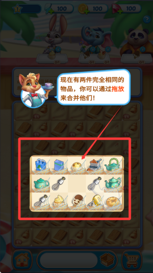1、玩家通过滑动屏幕合成相同物品,获取制作美食所需的食材和工具,满足不同客人的特殊订单需求,提升餐厅口碑。