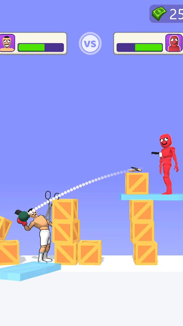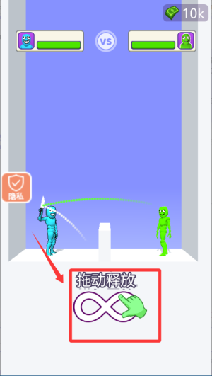1、游戏开始时先熟悉武器投掷的操作方式,点击屏幕调整角度与力度,把武器准确扔向敌人。