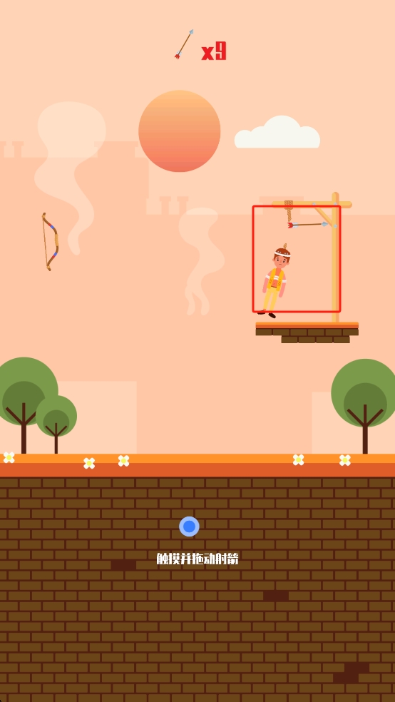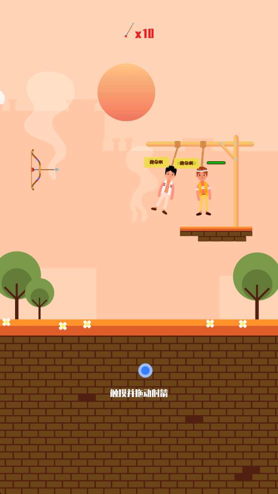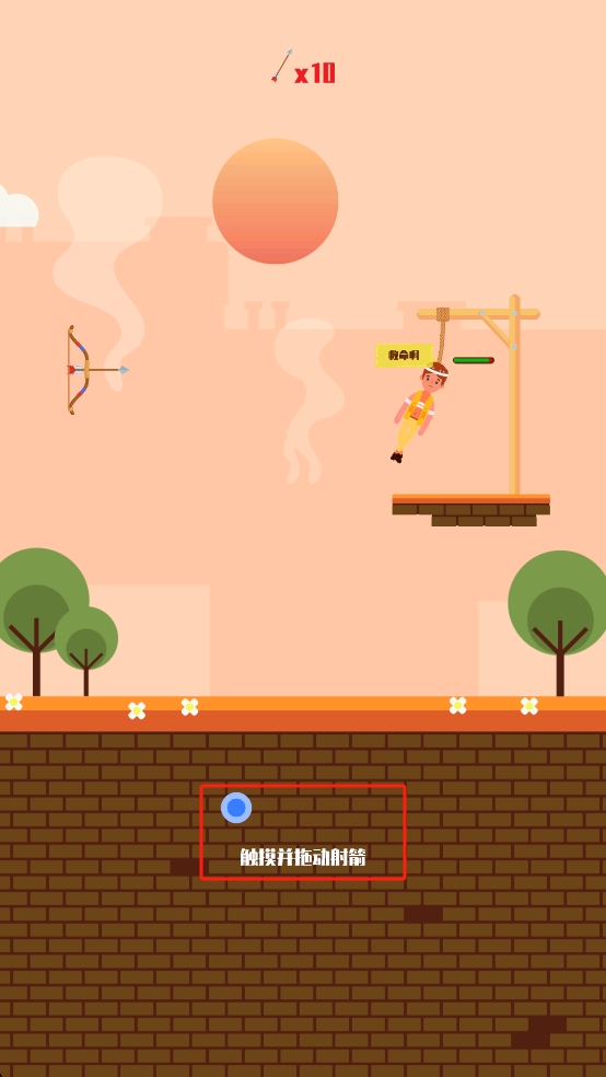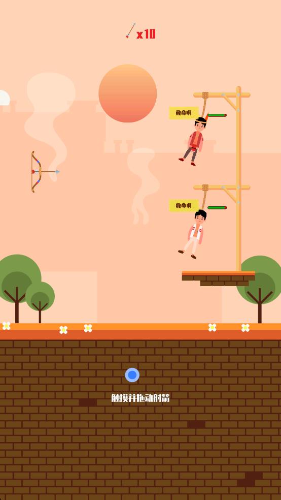 1、观察场景中人物被吊位置与弓箭布局,按住蓝色按钮拖动,调整射箭角度与力度,利用10支箭射断绑人绳索。