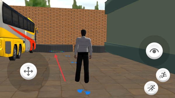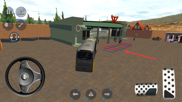 2、在场地中,用左侧轮盘移动角色,走到大巴旁的蓝色光圈,进入驾驶位,开始操控巴士。