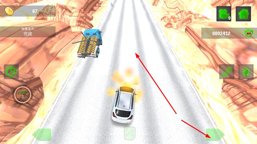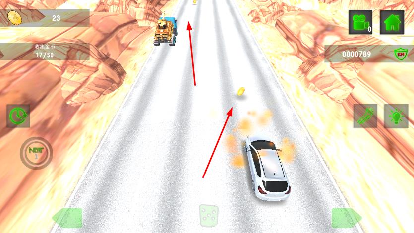 2、驾驶赛车在道路行驶,通过左右箭头按钮控制方向,躲避车辆、收集金币。
