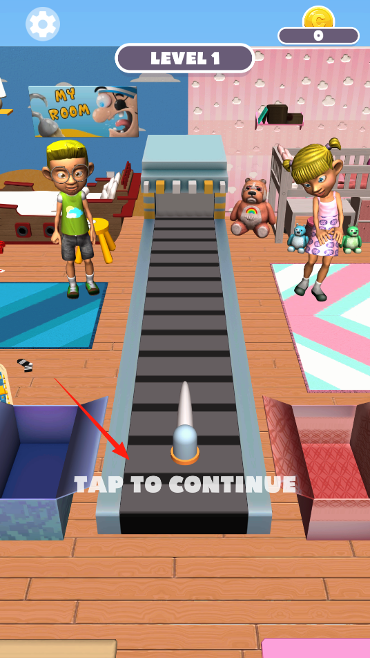 1、打开收拾好你的东西,界面提示TAP TO CONTINUE,进入第一关,轻触屏幕启动传送带,物件开始移动,准备将它们送入纸箱里,开启这场充满未知的传送带闯关。