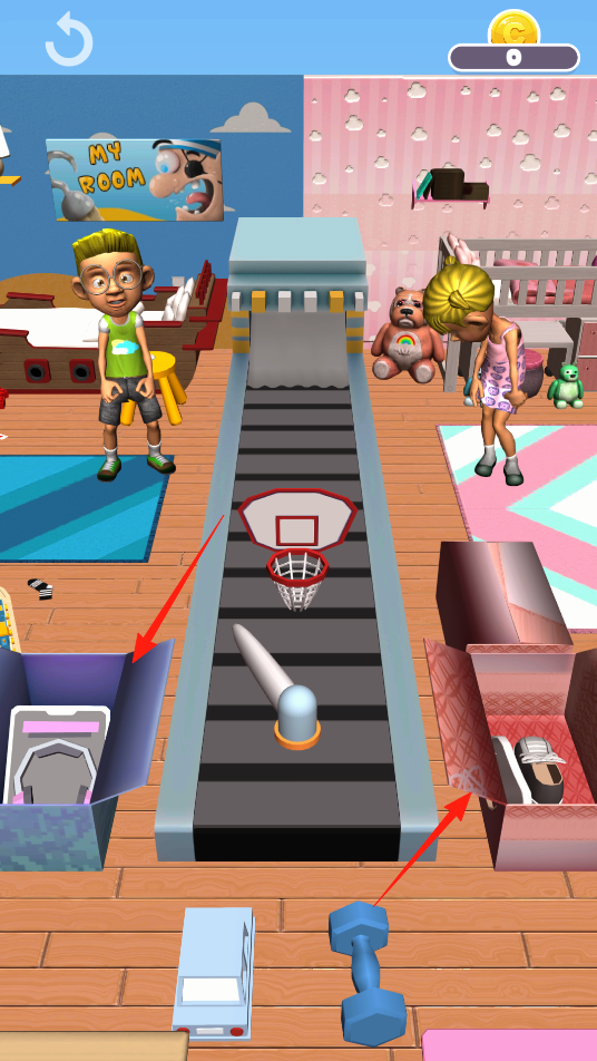3、传送带继续运行,关注物品移动,看能不能让特定物品进篮筐,完成关卡目标,体验融合投篮与传送带的创意玩法,快来自己试试吧。