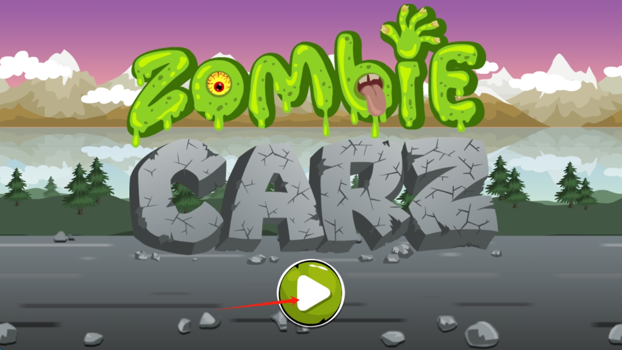 1、游戏启动界面,标题 Zombie Carz,背景为山水风景,有绿色播放按钮,点击开始游戏。
