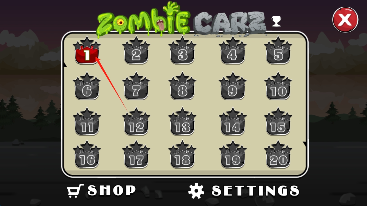 2、关卡选择界面,展示 1 - 20 关,第 1 关已解锁红色标识 ,有 SHOP商店 、SETTINGS设置 按钮,选择关卡。