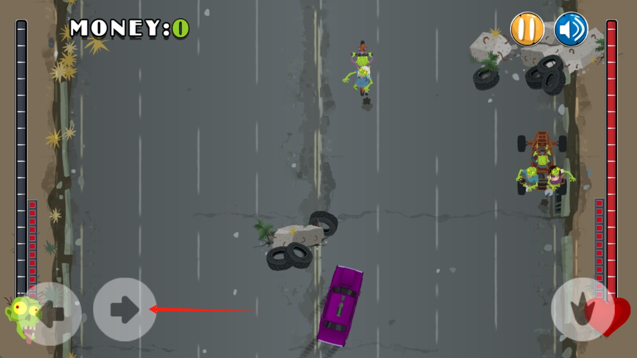 3、第 1 关游戏画面,操控紫色战车在公路行驶,躲避 撞击僵尸,界面显示 MONEY:0金钱 、暂停、音效按钮,点击移动。