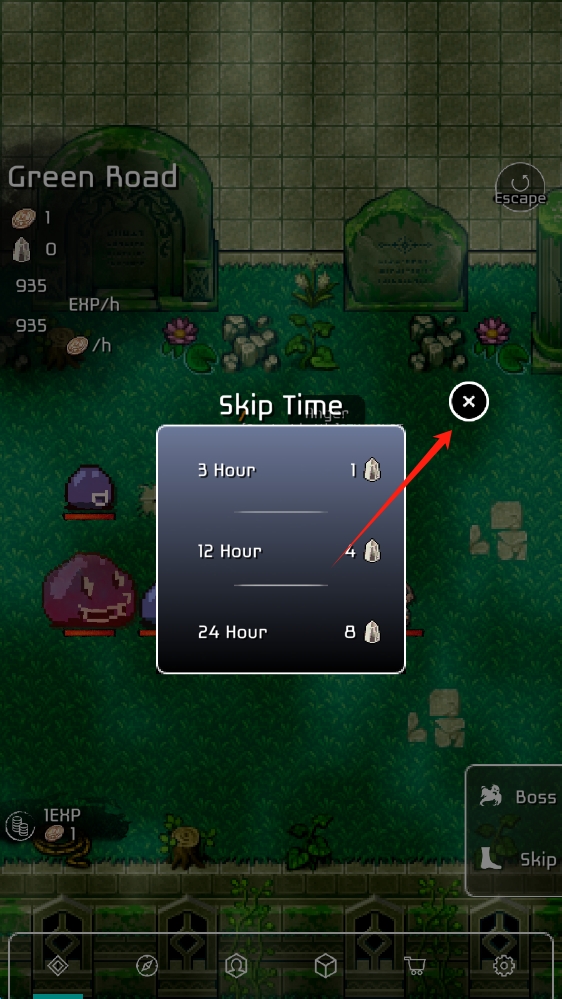 1、首图:场景 Green Road绿色之路 ,有Skip Time跳过时间 弹窗,可消耗道具跳过 3/12/24 小时,点击关闭。
