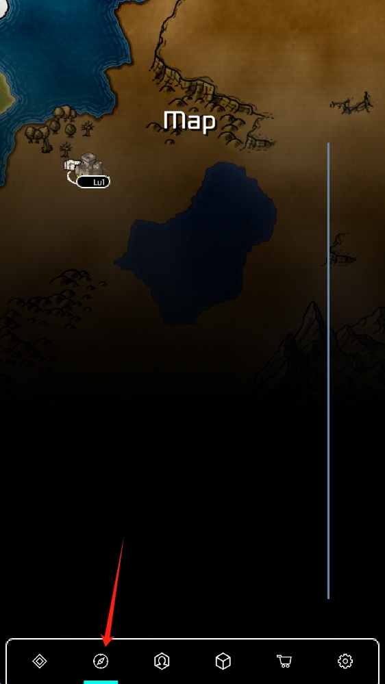 2、第二张:游戏地图 Map,显示已探索区域含 Lvl标识地点 ,底部有功能导航按钮,点击查看地图。