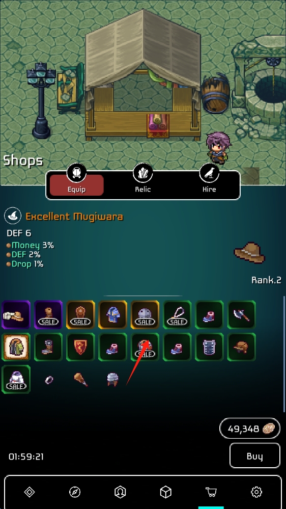 3、第三张:Shops商店 界面,分 Equip装备、Relic遗物、Hire雇佣 标签,点击购买。
