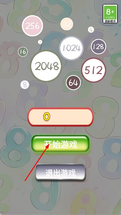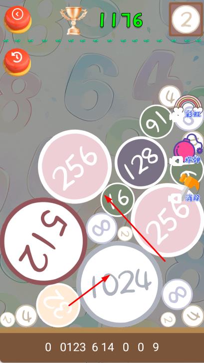 1、进入界面后,点击下方数字球,就会掉落至棋盘内,与相同数字球合并。