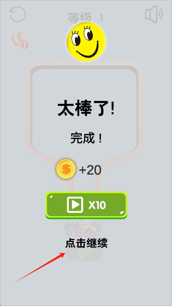 3、关卡完成,显示 太棒了完成!,获 20 金币,有 观看视频 ×10点击继续按钮,点击继续。