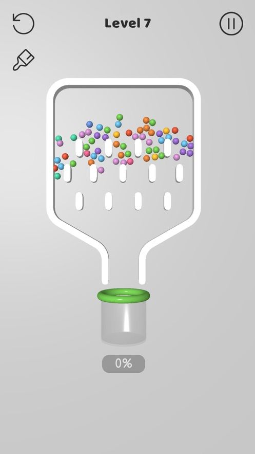 2、等级1关卡,需让彩色小球通过管道落入容器,界面含重玩、点击下落小球。