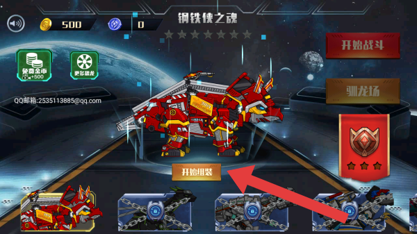 1、界面元素:金币、货币,点击开始战斗的按钮方可进入,下方是可组装的机械恐龙部件。