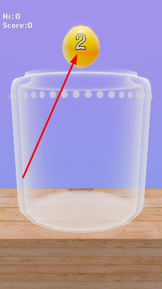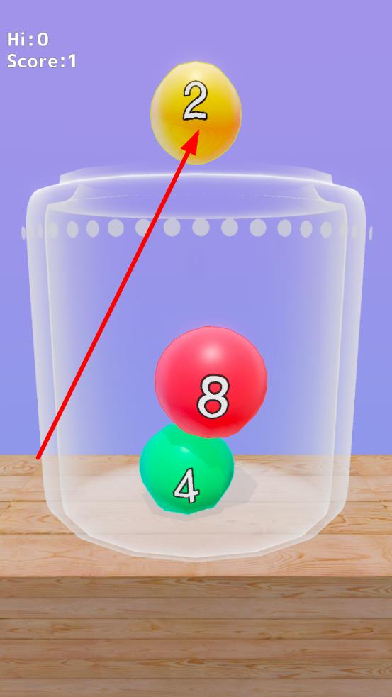1、屏幕上方会显示掉落带数字的果冻,点击或滑动屏幕,控制果冻落入透明容器,让相同数字的果冻尽量靠近彼此。