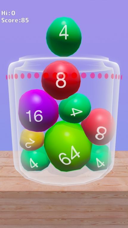 3、不断合成使数字逐步增大,积累积分,当容器空间不足时候则失败,完成特定合成目标,可解锁新玩法、道具,挑战高难度。