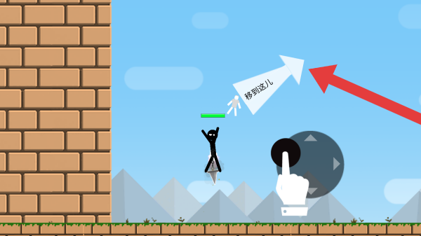 1、根据操作指引移到这儿进行移动,属于火柴人跑酷或动作闯关类,通过移动操作让火柴人跨越障碍。