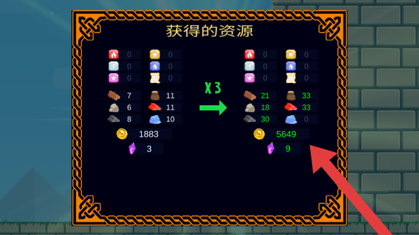 3、不同图标代表的资源,金币、紫色水晶等,显示资源数量的变化,金币从1883变为5649,紫色水晶从3变为9,体现资源获取及倍数加成情况。