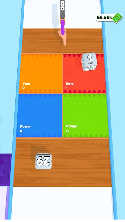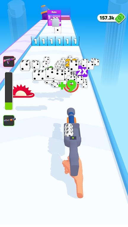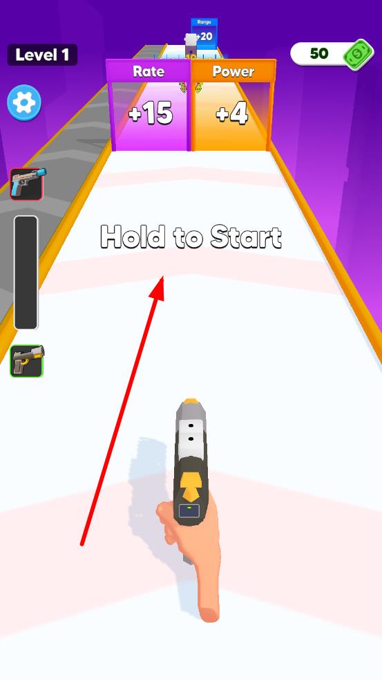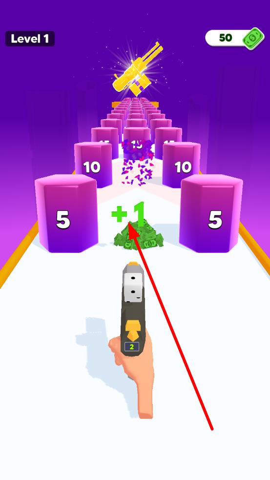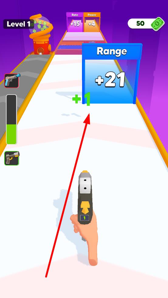 2、移动枪械,并穿过“Rate”“Power”等增益门,提升枪械属性;射击摧毁带数字的障碍物,收集道具、金币,能够提升枪械的性能。