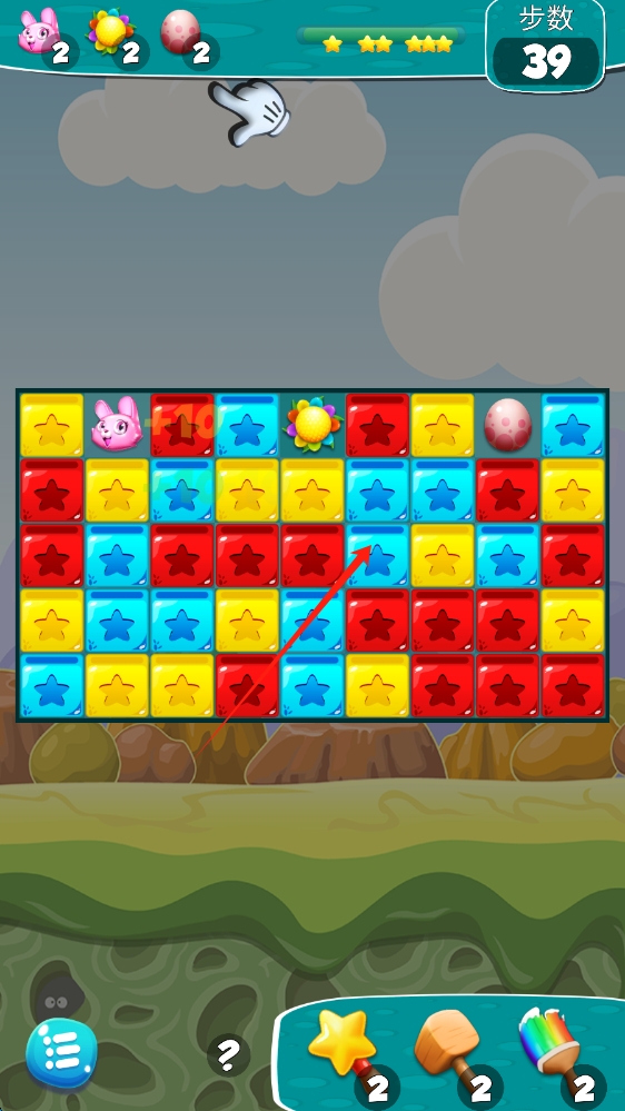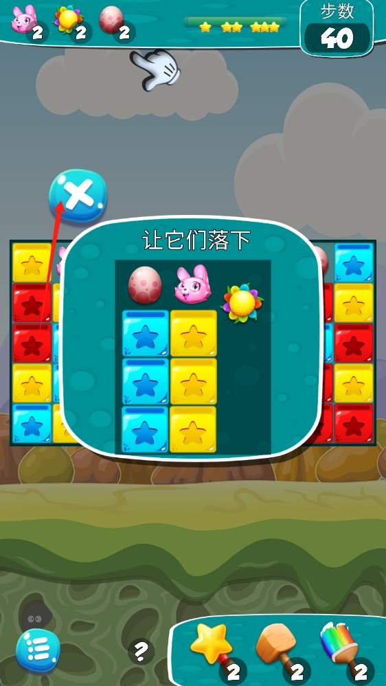 1、首图:关卡引导,提示 让它们落下,需消除方块使上方元素兔子蛋花掉落,点击关闭。
