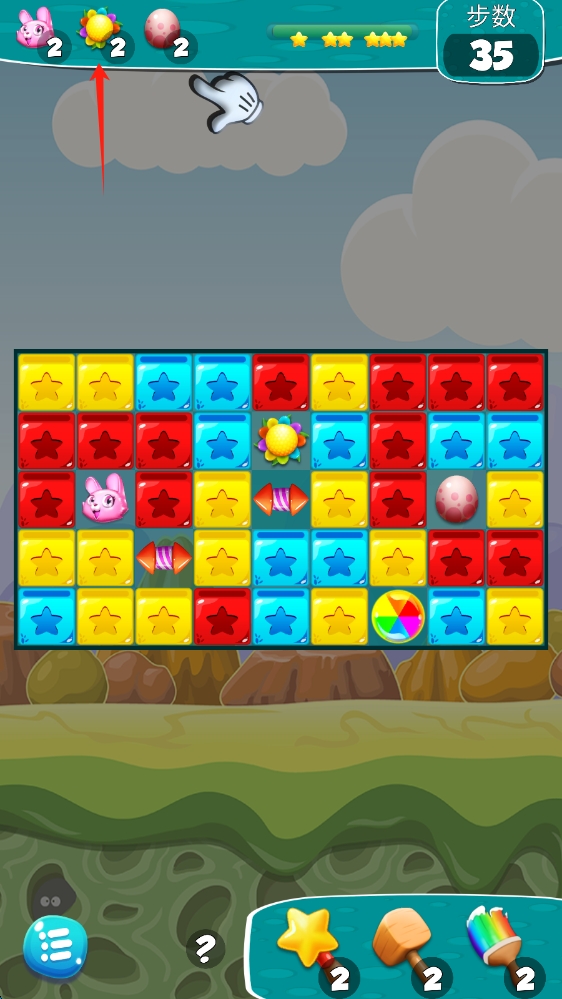 3、第三张:关卡中,上方元素兔子、花、蛋 随消除移动,步数剩余 35,道具栏显示可用次数,点击使用道具。