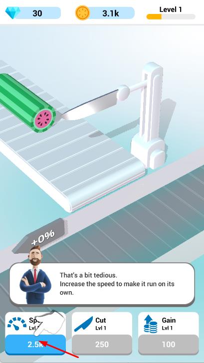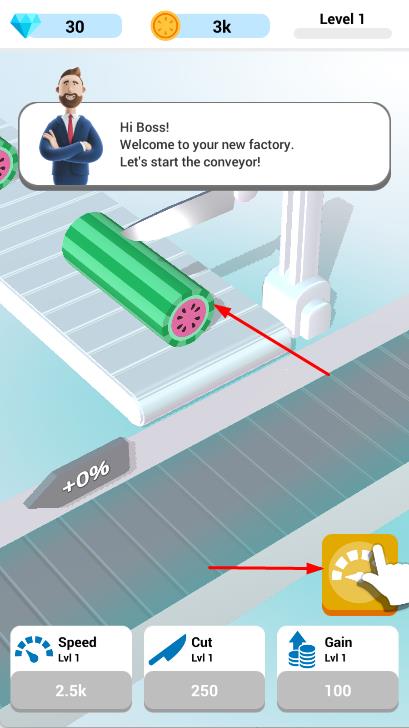 1、进入工厂关卡,点击黄色加速按钮,启动传送带,运送西瓜等物品。