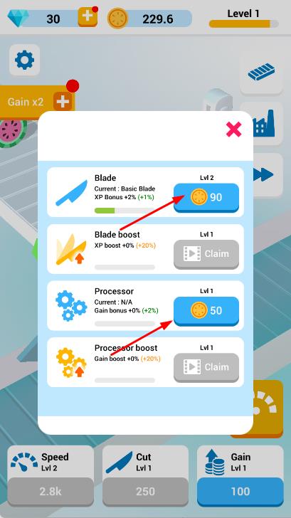 3、积累金币后,进入升级界面,消耗金币升级刀片,处理器等设施,提升生产效率。