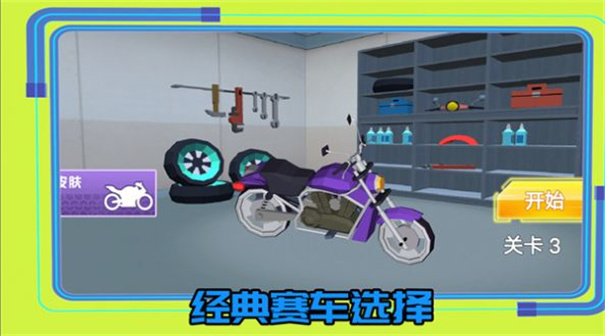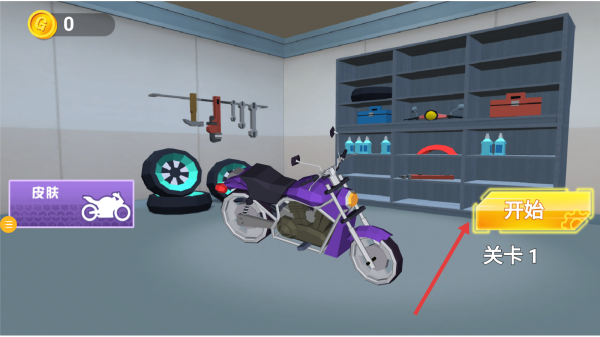 1、车库界面点击开始,选定紫色摩托车,进入关卡1对应的摩托竞速场景,开启比赛挑战之旅。