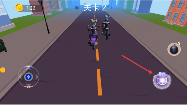 2、关卡2赛道中,用左侧摇杆控制行驶方向,点击右侧攻击按钮干扰对手,全力冲刺争取领先名次。