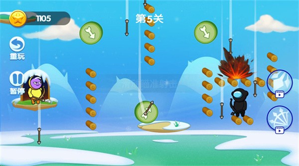 2、闯关过程中,利用动态地形与零重力环境,灵活运用解锁的冰冻箭、爆炸箭等特殊箭矢,应对不同敌人,提升射击精准度。