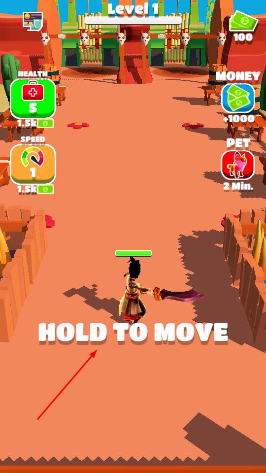 1、进入界面,点击按HOLD TO MOVE区域操控角色移动,开启冒险征程,这是行动基础操作。