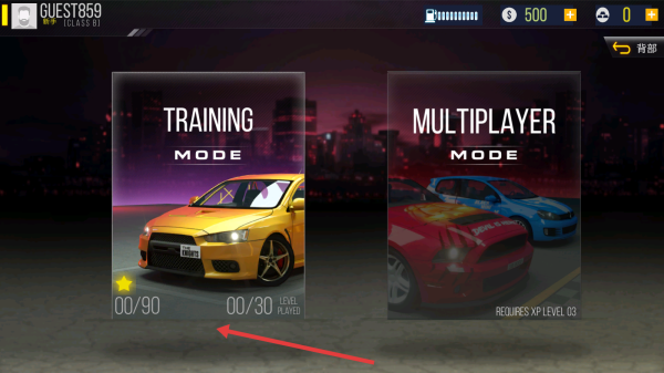 1、主界面选TRAINING MODE,黄色赛车需完成00/90训练目标,进入训练场开启驾驶练习。