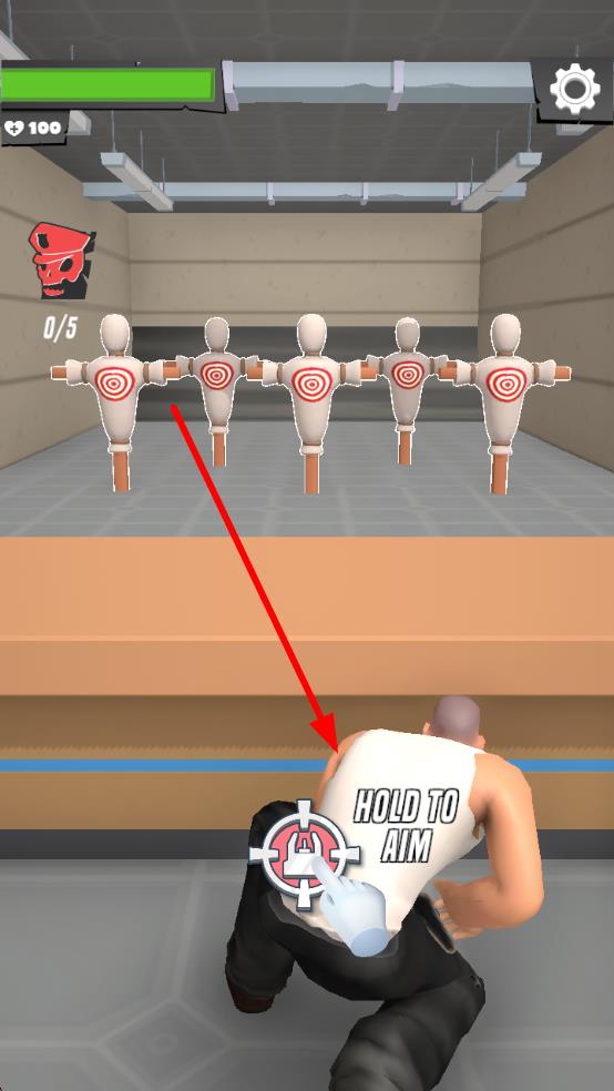 1、进入后能看到在射击场地界面,角色是蹲在地上的,长按角色身上“HOLD TO AIM”区域瞄准,调整准心对准目标假人。
