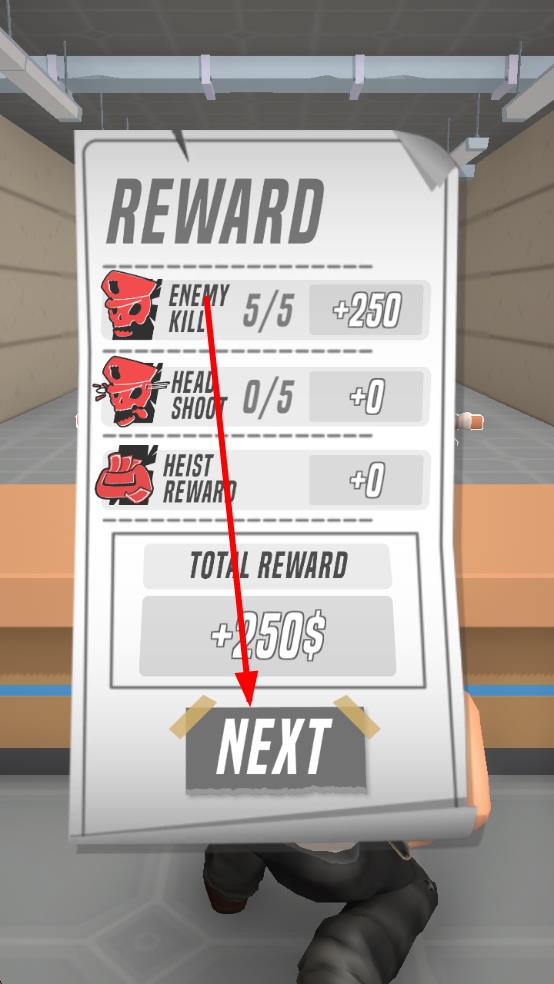3、成功完成当前关卡射击任务,界面显示“REWARD”结算,确认杀敌数、奖励等数据后,点击“NEXT”进入下一关,挑战其他射击任务。