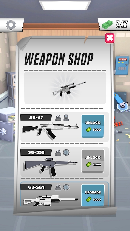3、枪械养成运用:收集奖励升级枪械,根据关卡特点切换武器,如狭小空间用手枪、开阔场景用步枪,发挥枪械优势,助力高效完成挑战,推进游戏进程。