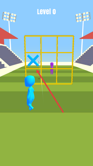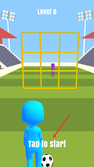 1、Level0时,点击Tap to start,操控蓝色小人踢足球,将球射入网格标记X,与紫色小人标记O博弈。